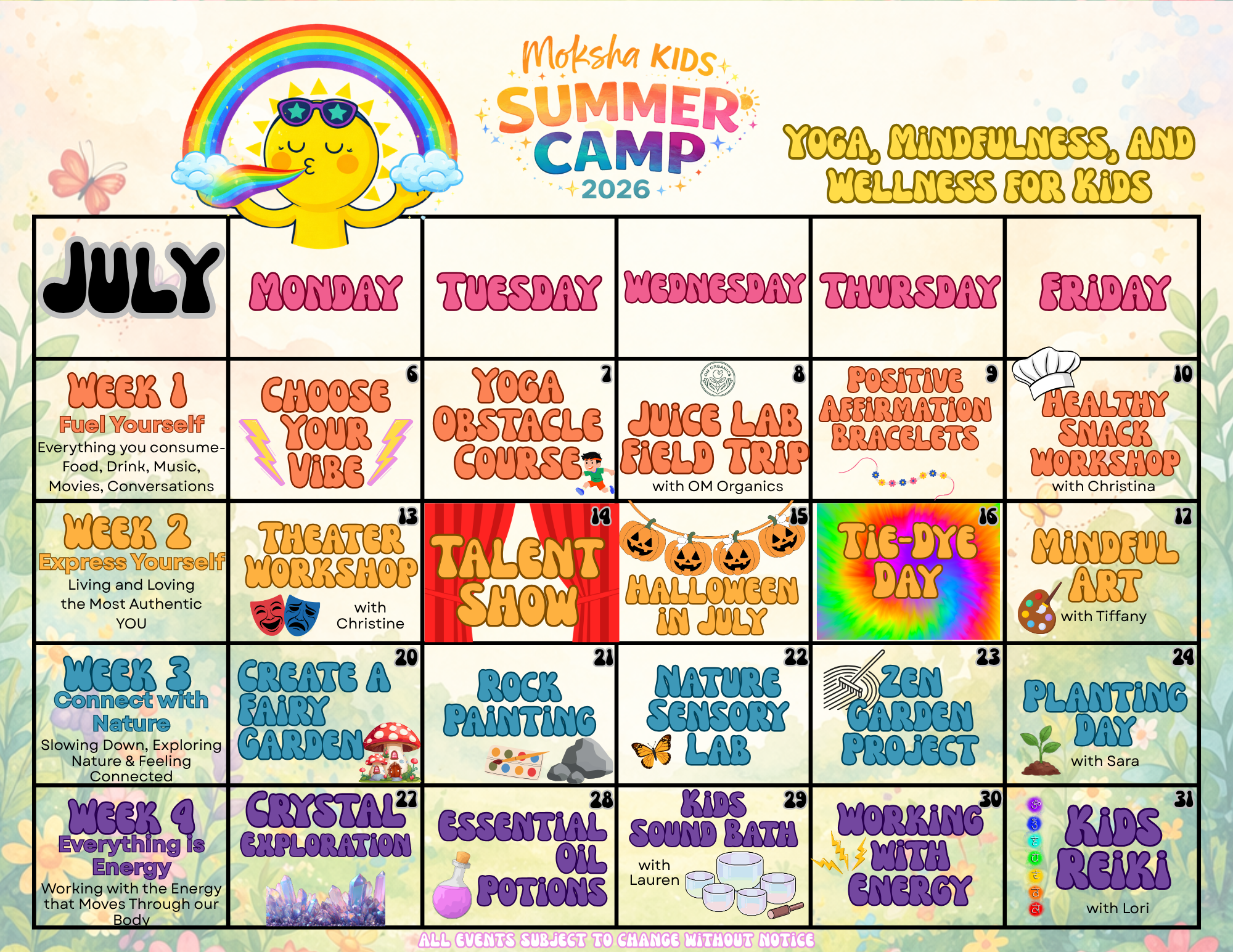 At Moksha Kids Camps and Classes, we foster a well-rounded, kind community where everyone helps each other out. Older children are encouraged to help mentor the younger kids and all students are expected to treat one another with kindness, patience, and respect. We teach and share the purpose of true Community.